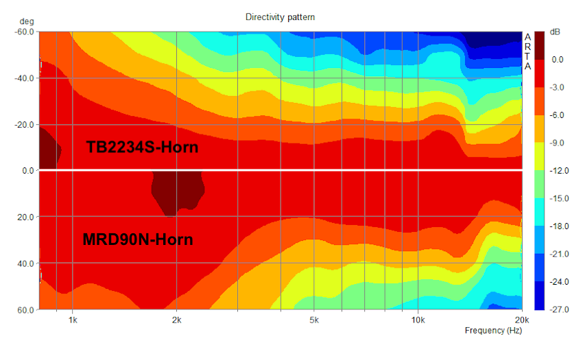 Ein Vergleich der horizontalen Abstrahlung, oben das TB2234S-Horn, unten das MRD90N-Horn: