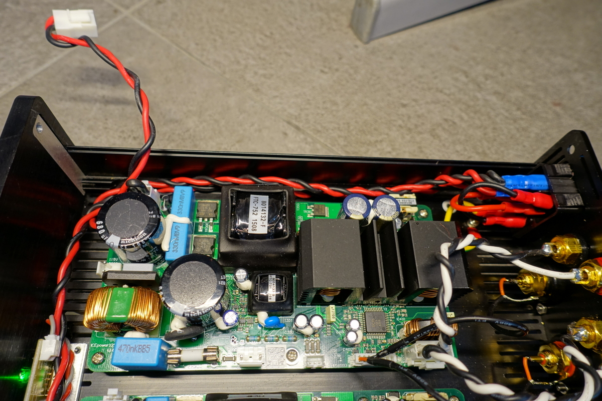 Stromversorgung nur von der IcePower für die rechte Box abgezogen, Einschalten: Pfeifen links.