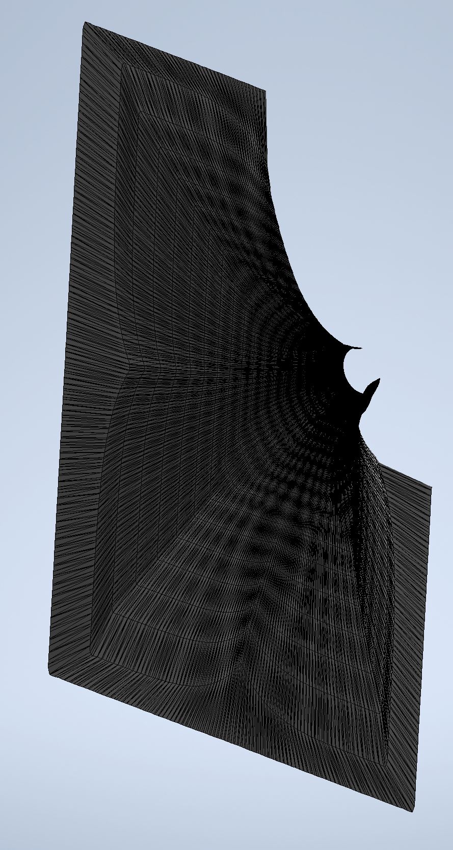 Und wie man sehen kann exportiere ich jetzt direkt ein Mesh aus Matlab. Die ganze Zeichnerei aus dem vorherigen Post ist jetzt also obsolet. So richtig praktisch ist das aber immer noch nicht. Ein einzelnes Oberflächenmesh kann man nemlich weder drucken noch fräsen. Ich habe zur Validierung dann doch nochmal vollständige 3D Modelle gemacht die aber auch ihre Schwächen durch die Mesh->Surface umwandlung haben: