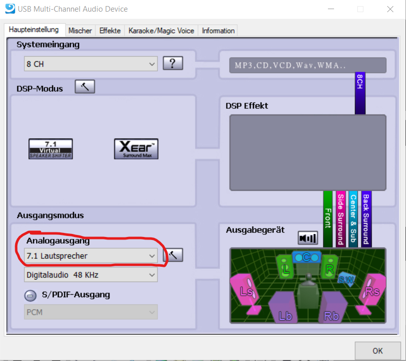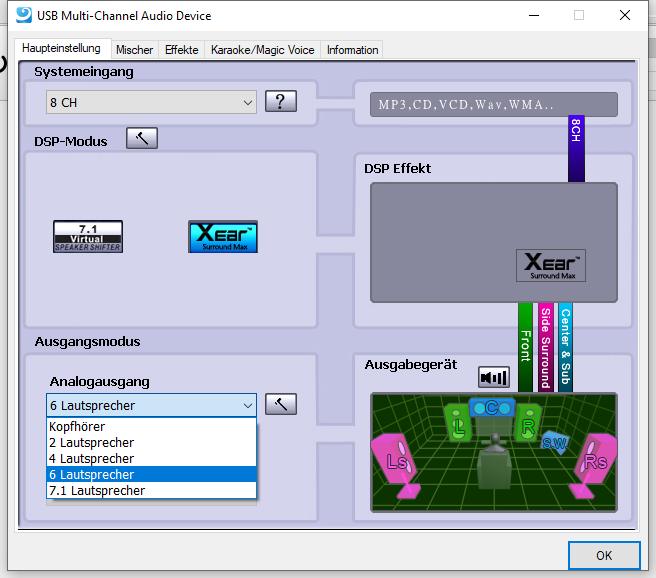 Immerhin kommt jetzt erstmals aus den Surround und Center/Bass Buchsen auch was raus. Allerdings erst nachdem ich auch 4- bzw. 6-Kanal gewählt habe.