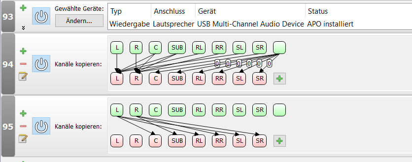 Dazu muss ich jetzt noch ein wenig mehr mit EQ APO zaubern, denn die UA0099 hat ja nur Line-Ausgänge, die JBLs aber nur symmetrische Eingänge. Nun habe ich an meinem UA0099 ja 3 funktionierende 3,5mm Stereo Klinkenbuchsen. Da dachte ich könnte ich ja mit EQ APO die Signalzuteilung z.B. so machen dass auf Buchse 1 der rechte Kanal, auf Buchse 2 der linke und auf Buchse 3 das LFE Signal rauskommt. Und damit die Signale symmetrisch sind würde ich auf den jeweils 2. Kanal jeder Buchse das invertierte Signal drauf geben.