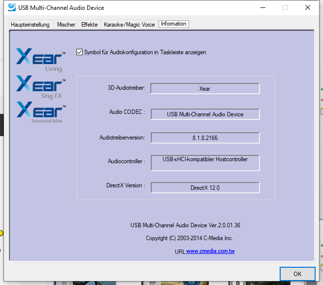 Als ich nach dem obligatorischen Rechner-Neustart den UA0099 an den USB Hub im Monitor wieder anschloss funktionierte die Musikwiedergabe in Stereo wieder wie vorher. Aber als ich versuchte die Cmedia Software zu öffnen kam rechts unten ganz kurz eine Fehlermeldung "USB Resource Problem bla bla ... " - ganz konnte ich den Text nicht lesen, denn er verschwand schnell wieder. Die Cmedia Software ließ sich - anders als vorher - nicht starten!