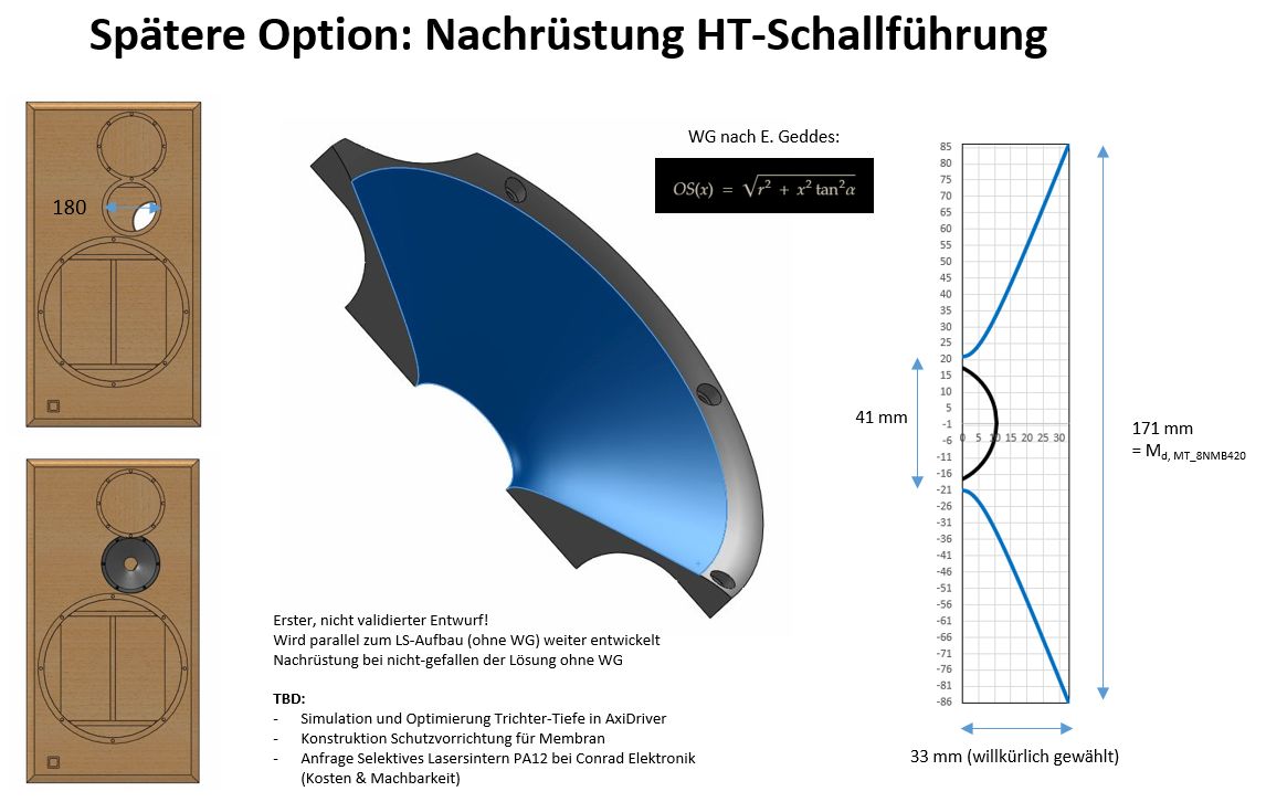 - Sinnvollerweise HT+MT in Schallführung. Falls keine Möglichkeit zur Simulation und Produktion besteht, dann einen fertigen nutzen, wie z.b. Limmer: https://www.limmerhorns.de/630-bc1/ (dort ist dann aber ein 6" Treiber vorgegeben).