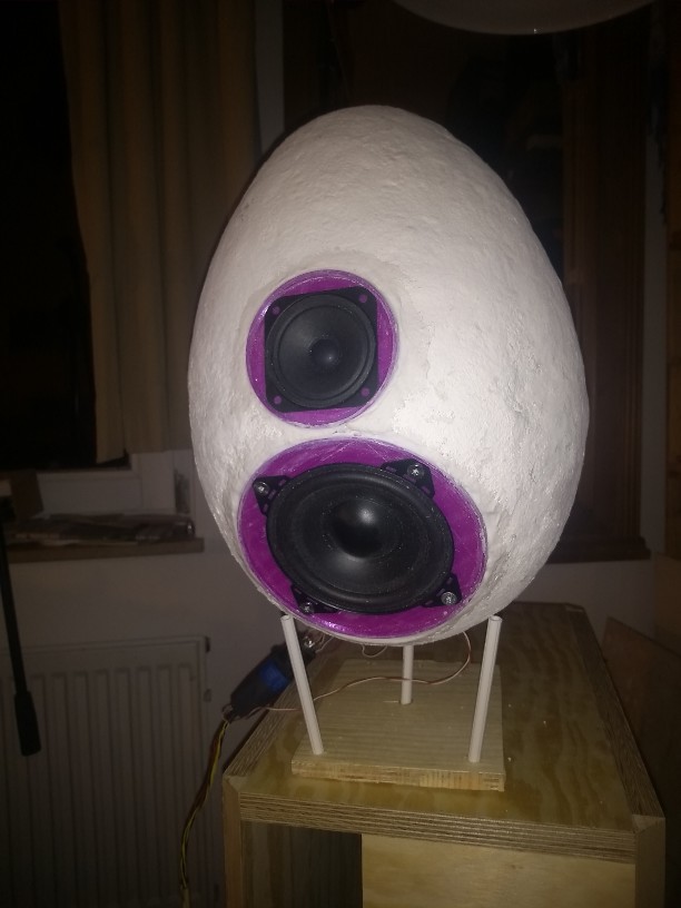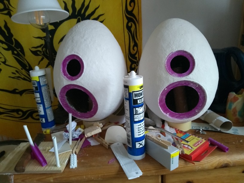 Das 2. Eigehäuse hat eben die erste Schicht (2.Hälfte) Pappmaché bekommen. Der Styroporkern ist noch drin.
