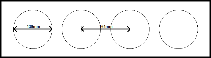 Skizze Testobjekt, fast entsprechend der finalen Mitteltonsektion, Frontansicht. Vier Stück 6" Chassis in Linienanordnung sind verbaut, in einer Schallwand, die kaum über die Korbmaße hinausgeht. Als Kreise eingezeichnet sind die Membrane, gemessen von Sickenmitte zu Sickenmitte (-> effektive schallabstrahlende Fläche). Der Durchmesser dieser ist 130mm, die Distanzen der Zentren zueinander je 164mm. Die Skizze ist exakt - 1 Pixel entspricht einem mm Realmaß: