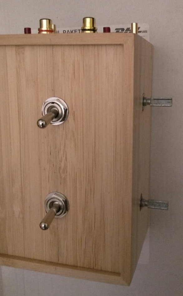 Da wir ein paar Endstufen zum Vergleich da haben, löte ich eine einfache analoge Umschalteinheit zusammen. Umstecken beim Hören dauert ungünstig lange und nicht immer ist es so eindeutig, wie bei dem Verstärkervergleich (FM300A Klon versus Icepower125asx2) in Schwelm. Um zu gewährleisten das sich die Endstufen nie "sehen" können, verwende ich einen 4-fach on/off/on 15A Schalter. In die Chinchausgang-Signalleitungen setze ich 100K Log Potis zur Pegelanpassung.