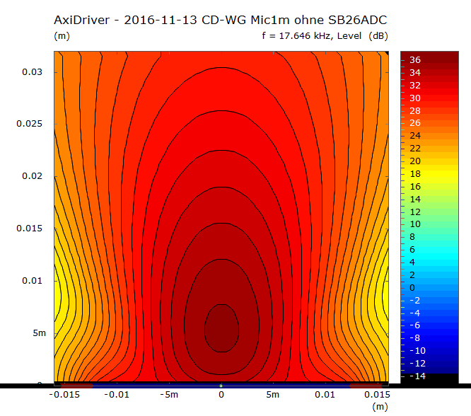 Der SPL fällt zu höheren Grenzen hin ab, da das simulierte WG die Kalotte 'lädt'. Die Bündelung des simulierten WGs wird zwischen 2 kHz und 20 kHz etwas enger (von +/-40° auf ca +/-30°) und zeigt kein perfektes CD-Verhalten, aber ingesamt sieht das recht gleichmässig aus.