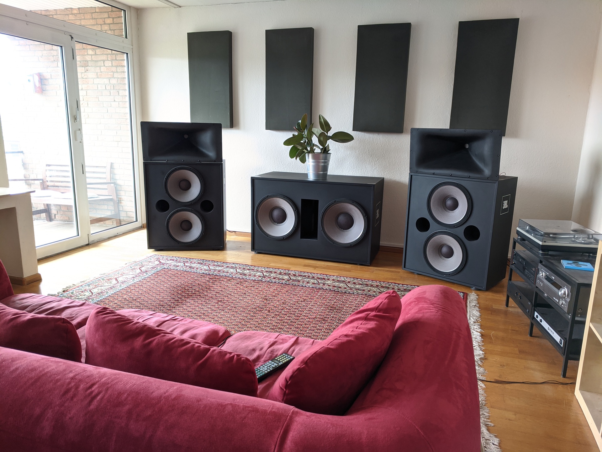 JBL 2453H-SL an JBL 2384. Der Treiber stammt aus der Highend-Discobox JBL MD2, das Horn selbst wird in etlichen Kino-Lautsprechern von JBL eingesetzt.