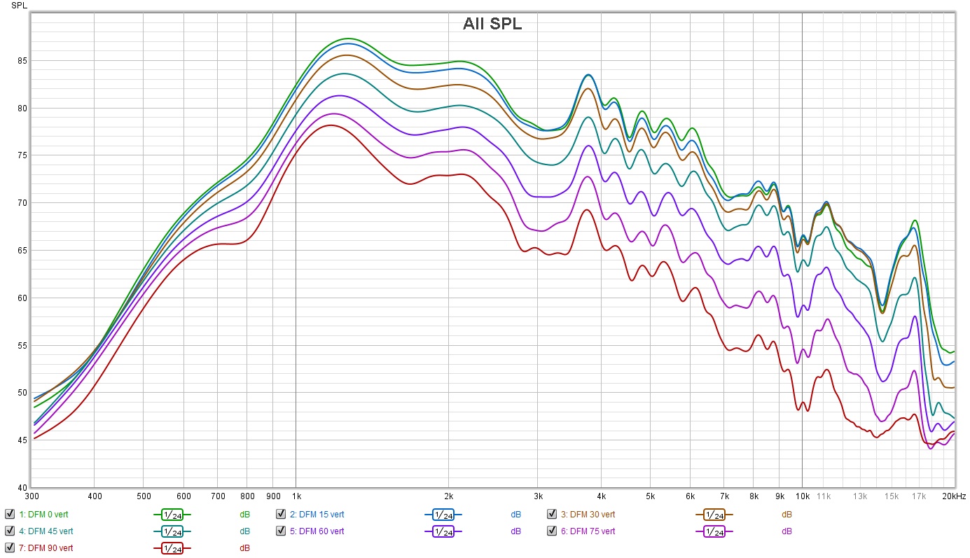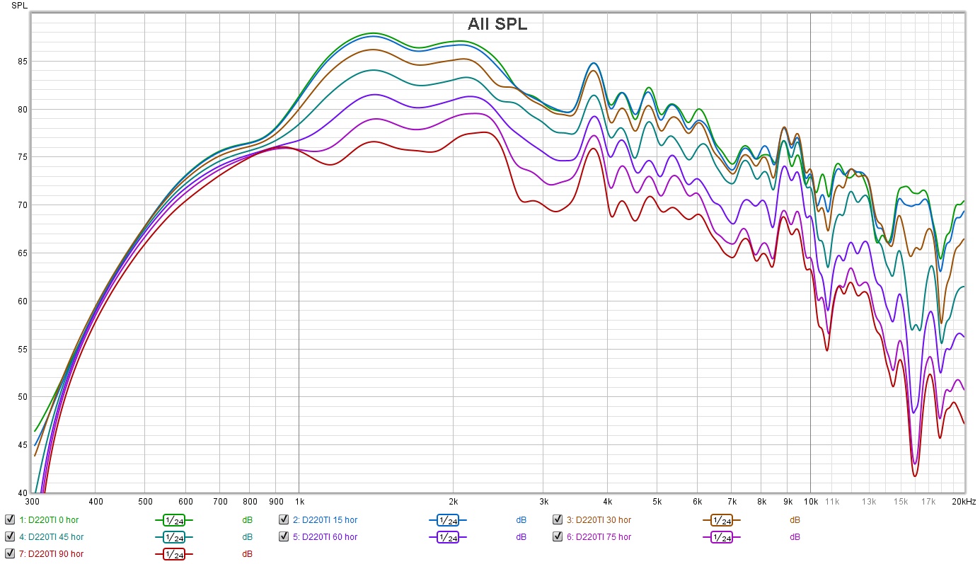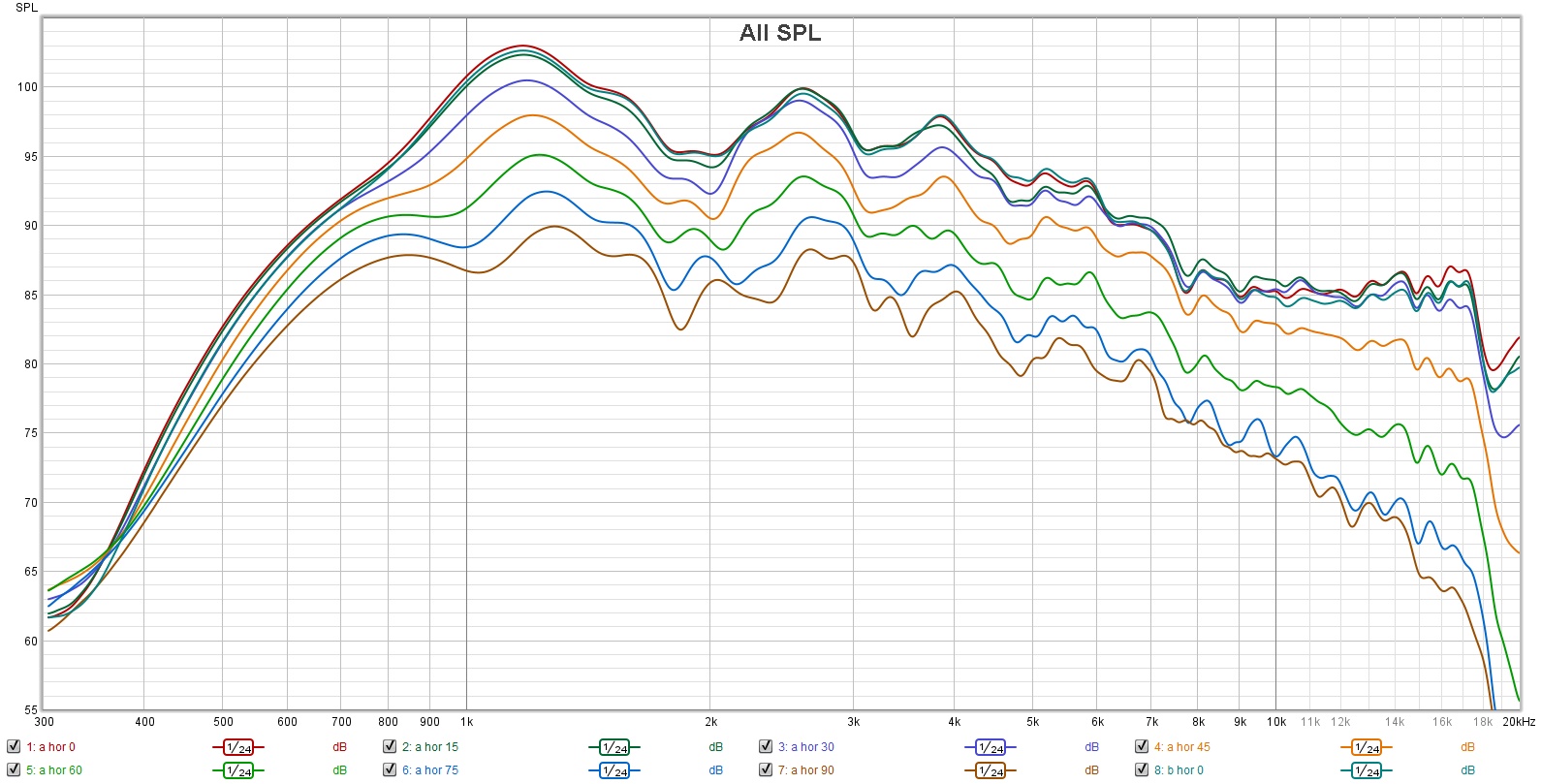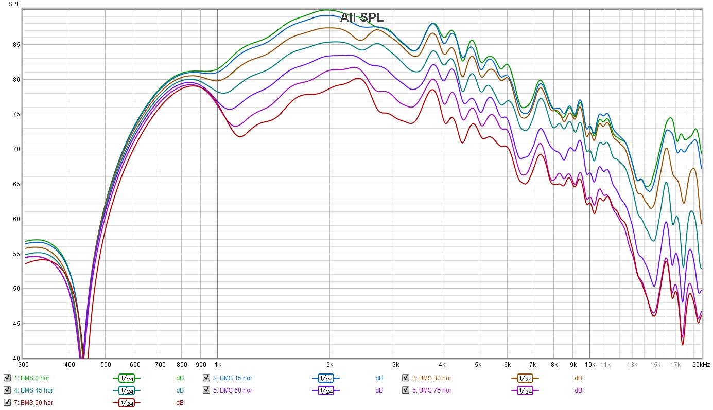 JBL2344 horizontal in Schritten 0°,15°,30°,45°, 60°. Beide Treiber unter exakt gleichen Bedingungen im Gartenfreifeld gemessen.