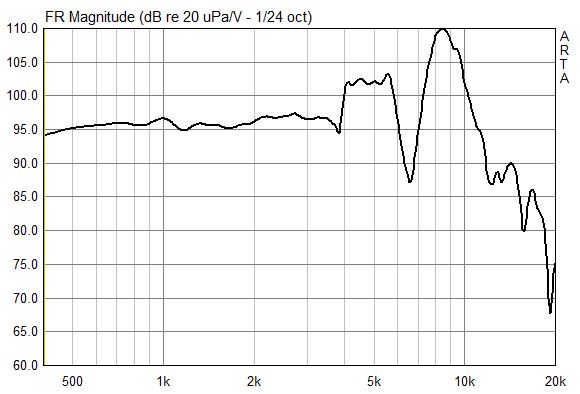 Von irgendwelchen Stufen/Resonanzen ab 2kHz wie im Datenblatt ist nichts zu sehen. Der Treiber spielt blitzsauber bis knapp 4kHz, wo er dann in Resonanzen aufbricht.