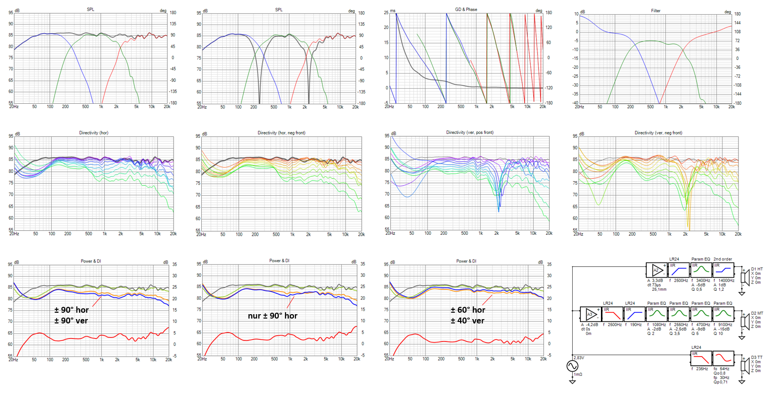 Messfenster +/- 40° horizontal, +/-20° vertikal, mit Gate, Glättung 1/12 Oktave, Achsfrequenzgänge TT und MT sind mit Nahfeldmessungen plus Schallwandsimulation gefügt.