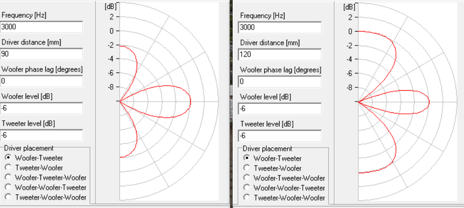 Ab Lambda/2 = Treibermittenabstand handelt man sich die erste vollständige Auslöschung in der Senkrechten bei ver = +/-90° ein, einhergehend mit einer Reduktion von -3dB im Leitungsfrequenzgang. Bei 100 mm Treiberabstand wären das ca. 1,7 kHz, bei 270 mm sind's 630 Hz. Will man den -3dB Einbruch größtenteils vermeiden kann man als Faustregel die Trennfrequenz nochmal halbieren (Lambda/4). Bei der MT/TT-Trennung passt das, bei der HT/MT-Trennung lässt sich dass in der Praxis nirgendwo umsetzten.