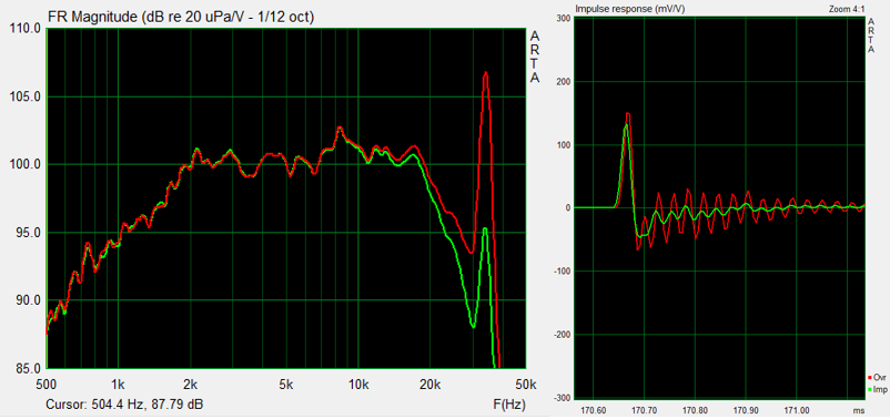 Den Sperrkreis auf die 34kHz-Reso beim T25A kann ich übrigens empfehlen, muss aber sorgsam hingefummelt werden (kostet kaum, eliminiert aber das letzte technische Argument den T25B für's doppelte zu kaufen zumal der A noch breiter abstrahlt. Und ich bilde mir ein dass es tatsächlich vom Sound was bringt...)