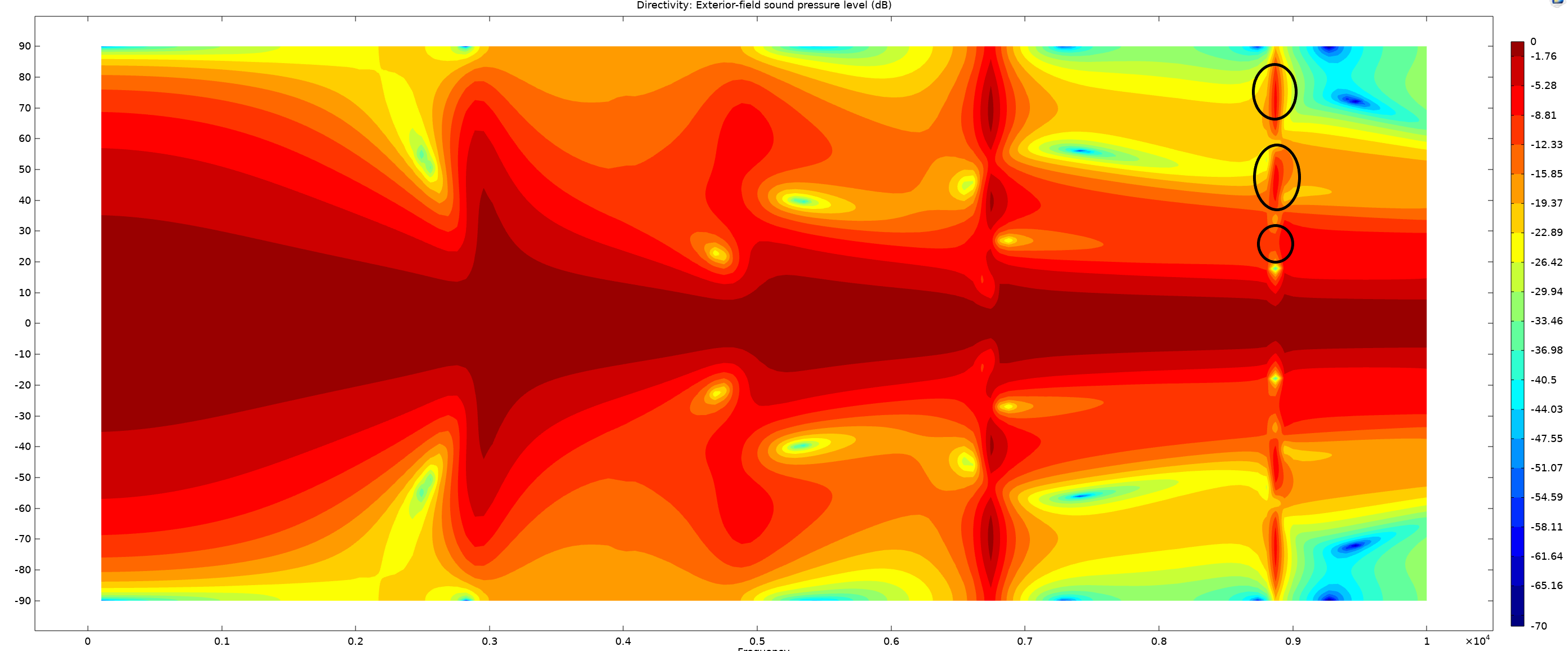 Planen der Kompressionskammer. Es wird festgelegt, wie die Kammer aussieht und wie groß das Kompressionsverhältnis sein soll. Größer bringt mehr Wirkungsgrad, kann aber zu Verzerrungen führen wenn man es übertreibt. 1:8 wird da gerne als Maximalwert genommen**. Hat man das gemacht, simuliert man erstmal nur das und sucht sich dann die höchsten auftretenden Radialmoden raus, hier bei ca. 6900 Hz: