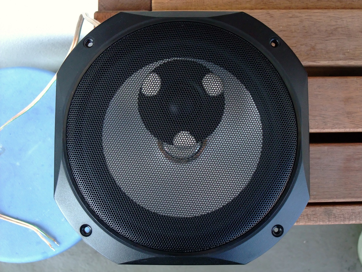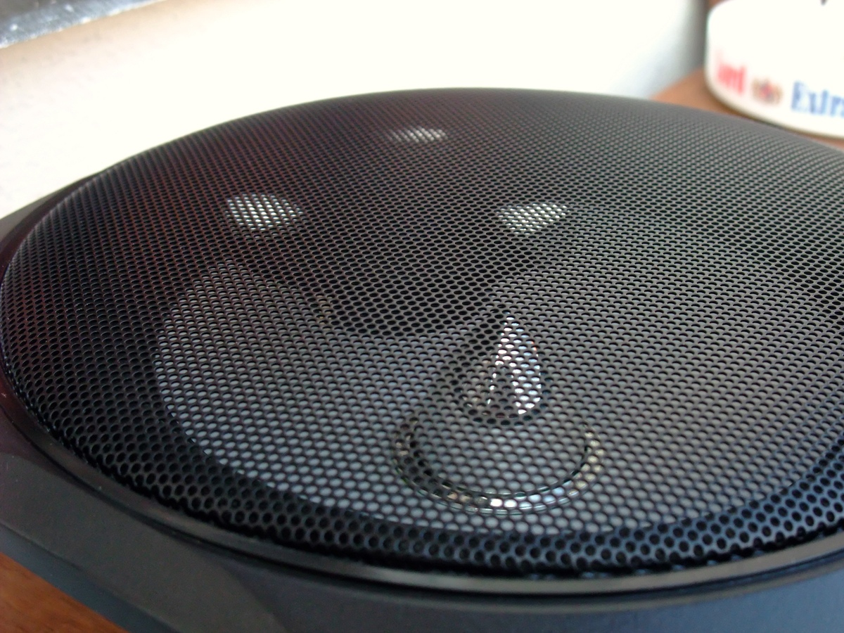 Die Kalotte kann man von hinten mit kleinen Schrauben am Gitter befestigen (ich habe es erstmal provisorisch mit Knete gemacht). Die Schallwand der Kalotte darf allerdings nicht bündig aufliegen, sondern man braucht 2-3mm Abstand, da die Kalotte etwas höher baut und natürlich nicht an das Gitter stoßen sollte ;)