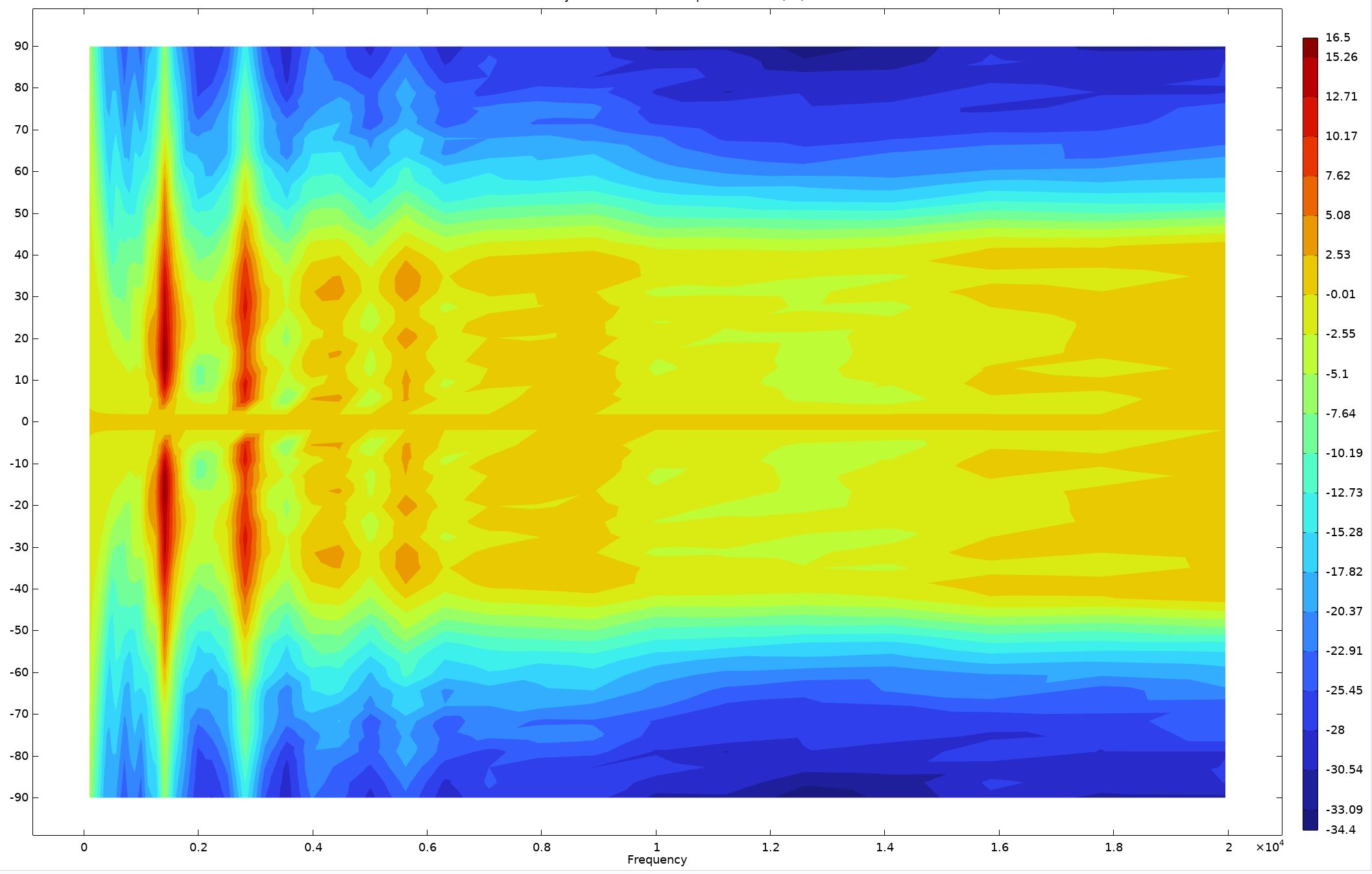 Also, versuch nummero Uno. Sphere mit 30/45° Winkel gegenüber einer unendlichen Schallwand und 2 m Durchmesser. Messung in 10m Abstand und linear skaliert auf der x Achse: