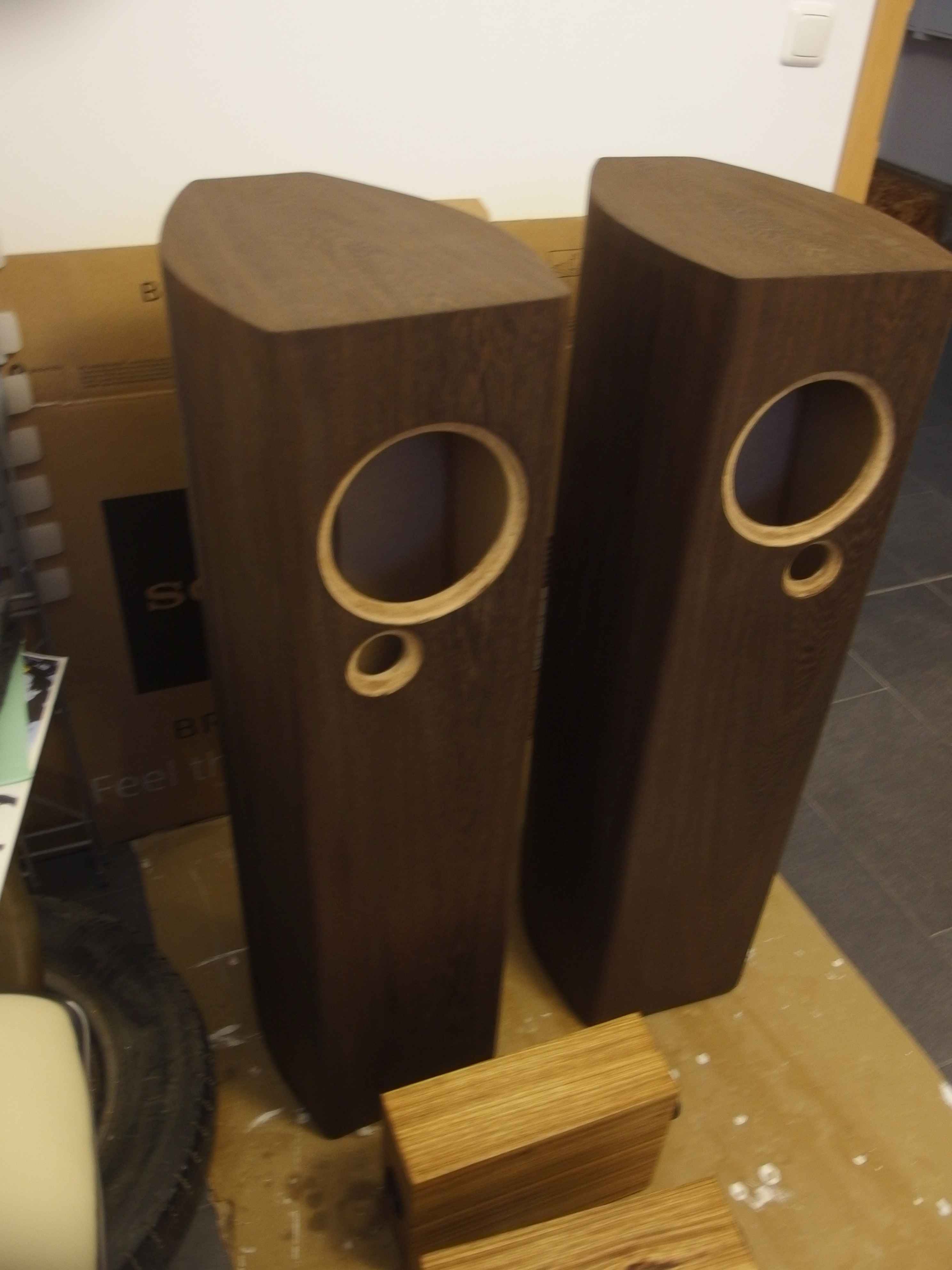 Die Boxen wurden gestern Abend nach 48Std. Trocknung ein zweites Mal mit Leinölfirnis angefeuert und so wie es aussieht, wird auch noch ne dritte Schicht Öl aufgetragen, bevor ich mich ans Wachsen mach.
