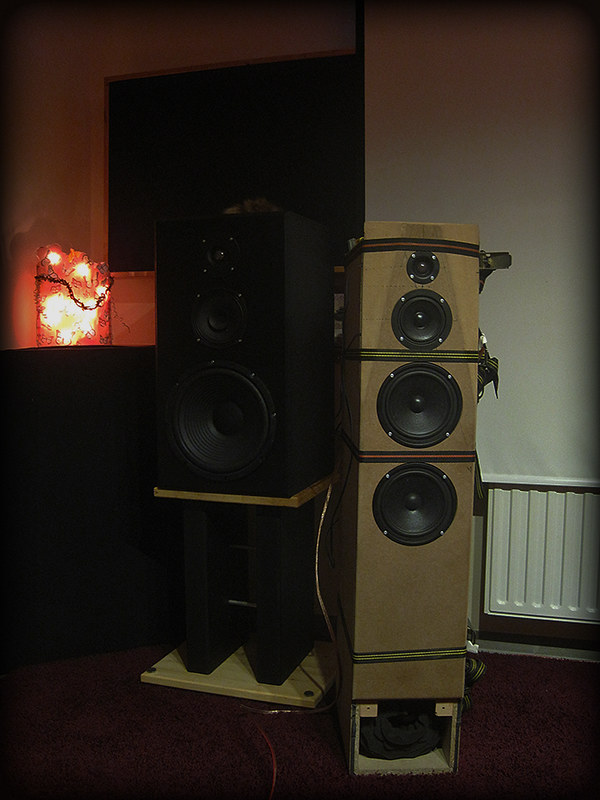 In Echt sehen die bisschen stimmiger aus mit Chassis verbaut... Auf den Fotos kommen die Chassis so grau/braun rüber, weil die Lautsprecher so extrem tiefschwarz sind :D