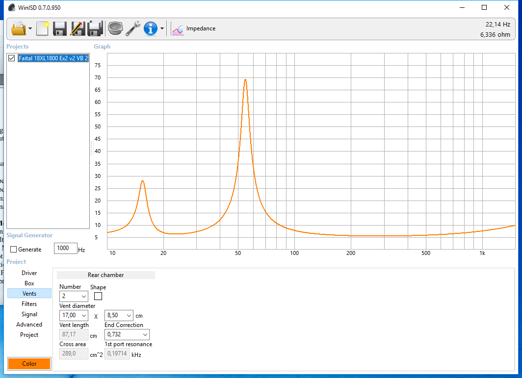 So, gerade habe ich die erste Messung mit der tiefen Abstimmung gemacht. Berechnet war die Box auf Grundlage der zuletzt gemessenen TSP auf 22Hz, dafür sollten die zwei BR-Kanäle bei zusammen 289cm2 Querschnitt 87cm lang sein. Ich habe die Kanäle in 2 gegenüberliegende Ecken gelegt und musste sie hinten in der Box dann um 90° abwinkeln (die Box ist innen nur knapp 55cm tief). WinISD errechnete damit diesen Impedanzverlauf: