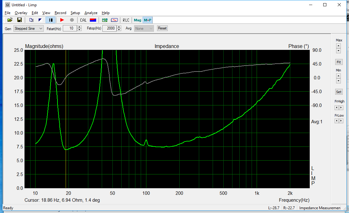 Abgesehen davon habe ich mit 20 Hz eingewobbelt, dort hat das (uneingebaute!) Chassis sogar leicht über 8 Ohm.