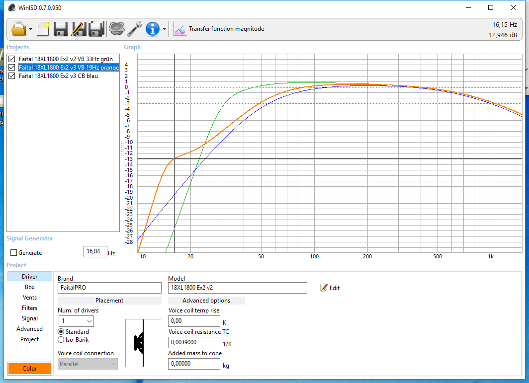 Das war für mich quasi die erste Probe ob und wie weit man WinISD trauen kann. Die zweite kommt wenn ich die tatsächlichen Frequenzgänge messe. Das wird aber noch etwas dauern.