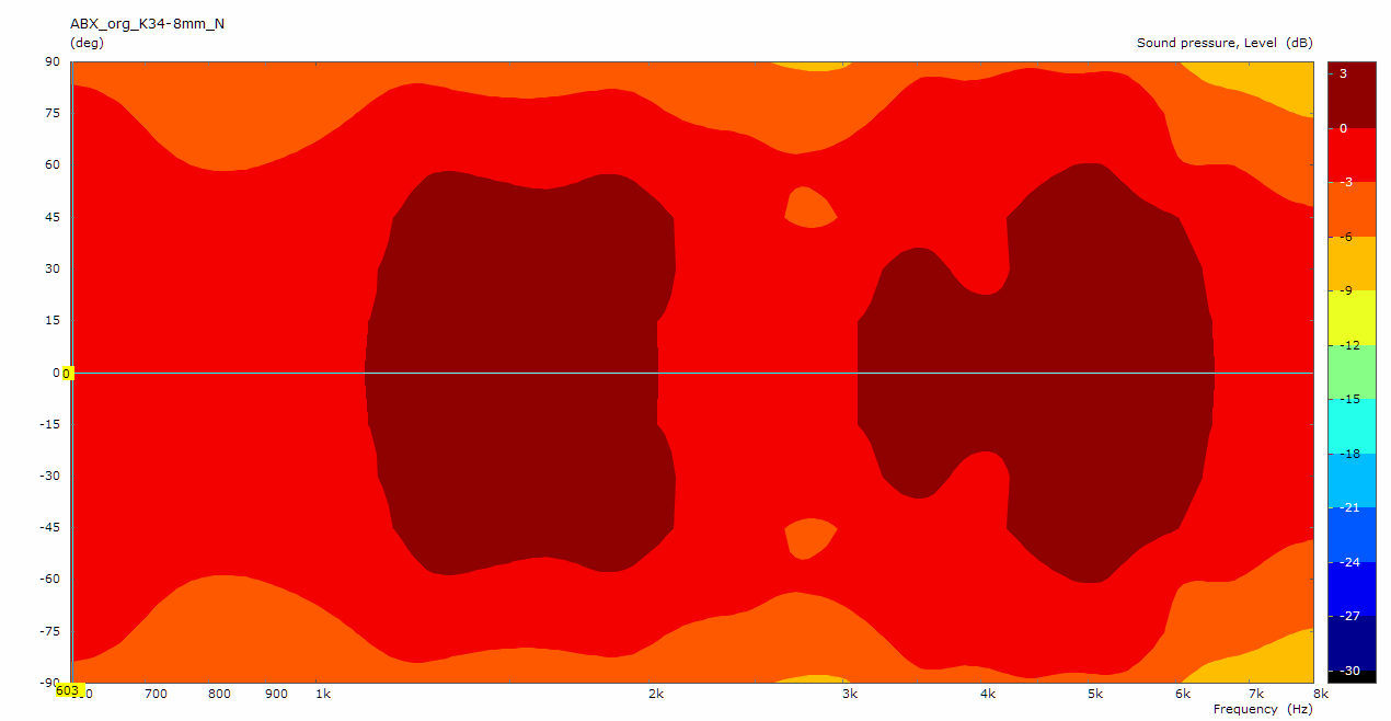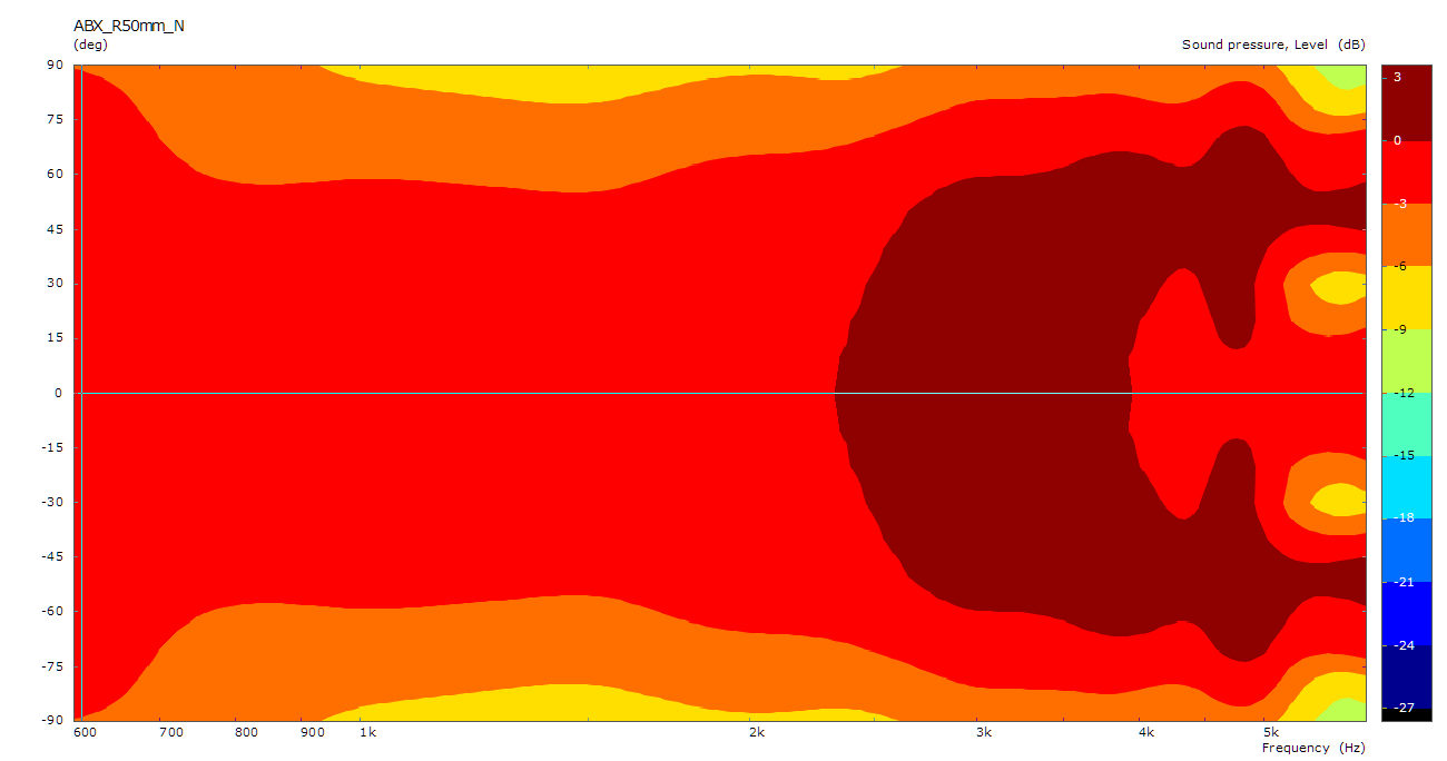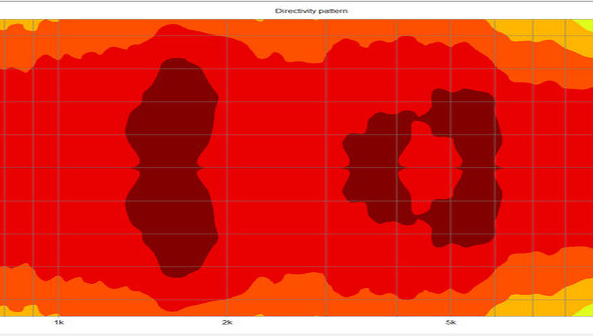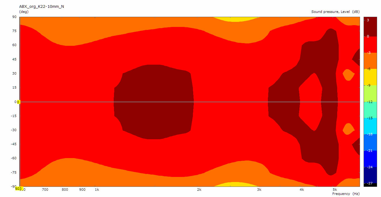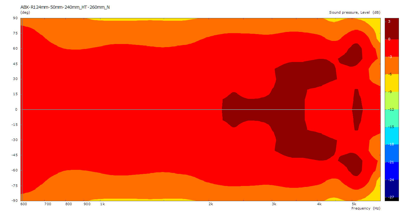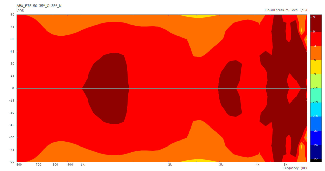 Im Sonogramm sind die kritischen Stellen nun ziemlich gut getroffen. Die stärkere Bündelung zu höheren Frequenzen setzt in der Simu genau an der richtigen Stelle ein.
