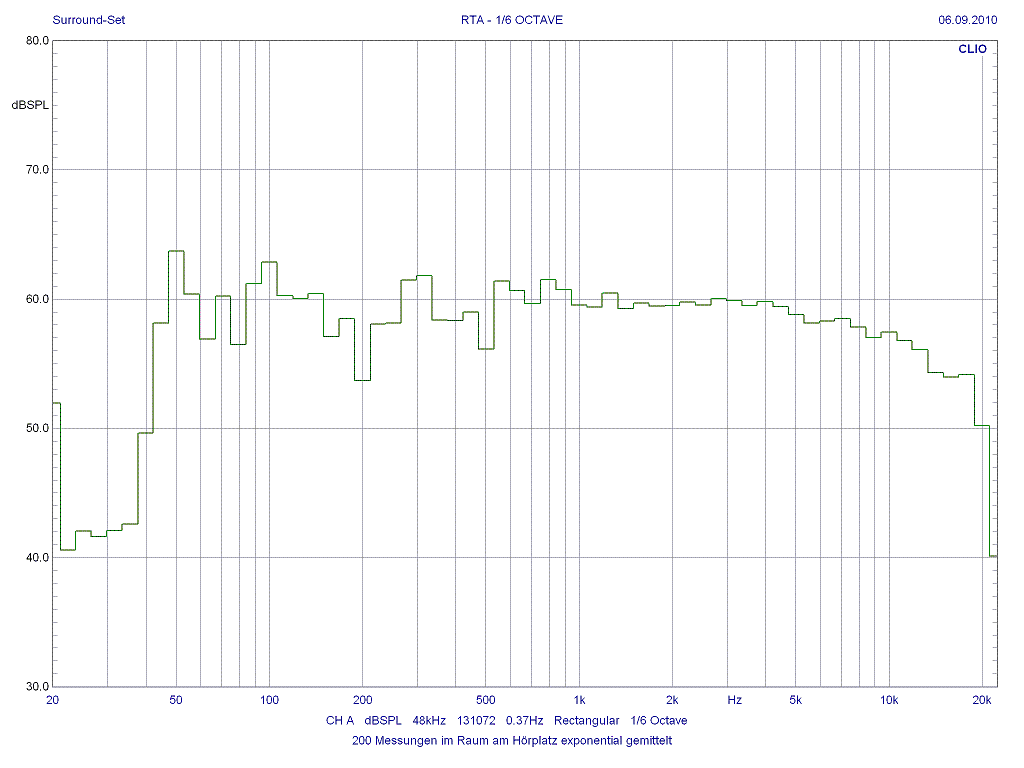 Ich finde die Abstimmung ist äußerst gelungen. Die Senke um 200Hz dürfte die Bodenreflektion sein. Der Buckel um 50Hz ist die Längs-Stehwelle des Raumes. Der Abfall im Superhochton ist typisch für Messungen im Raum.