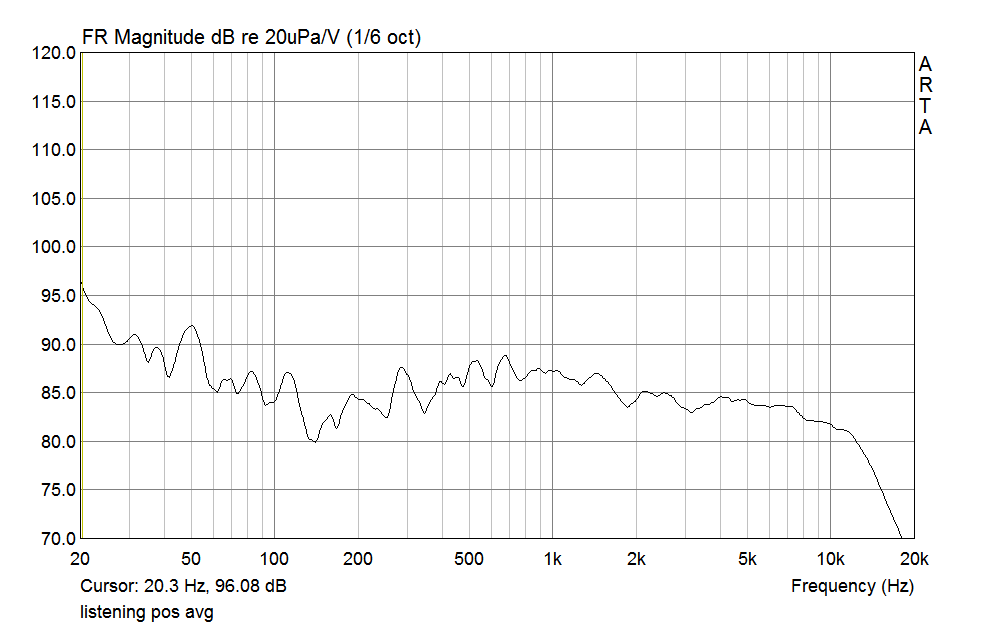 Gemessen wurden 7 Messpositionen um den Hörplatz (+-45cm hor, +-30cm vertikal). Glättung: 1/6 Oktav. Und am Ende gemittelt. Ergebnis: