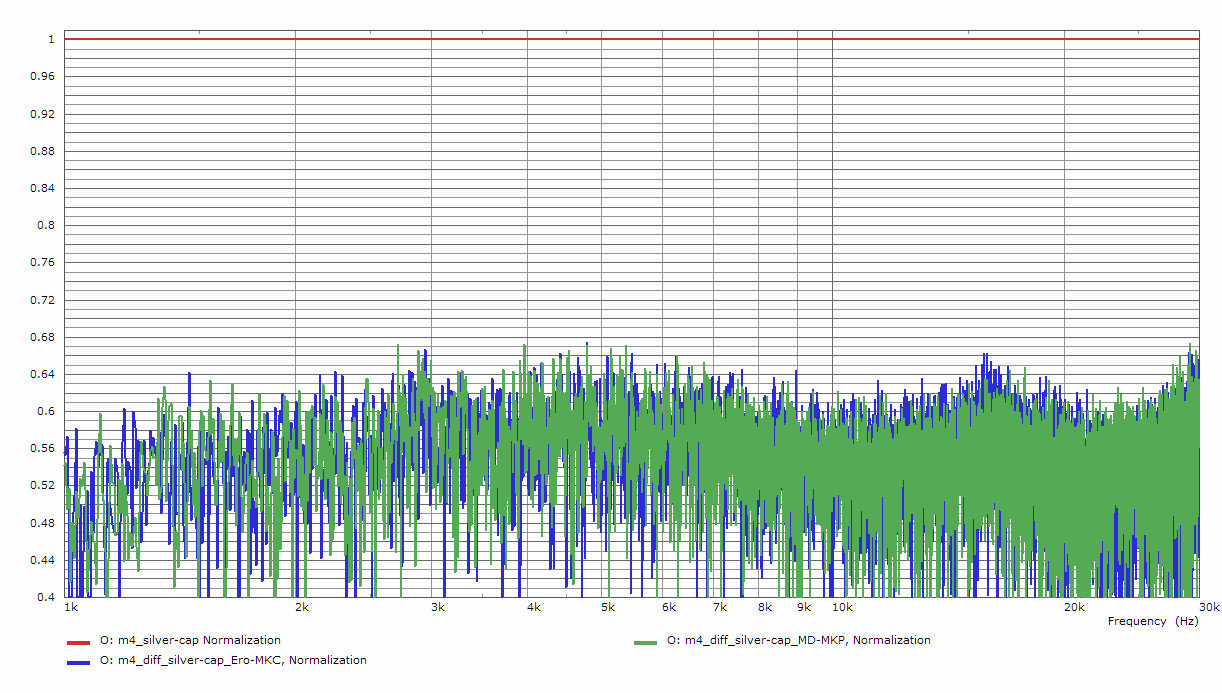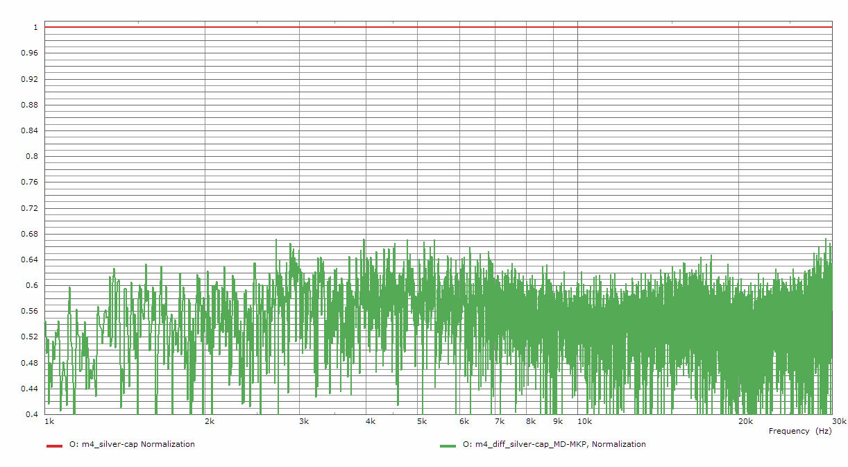Hier liegt die Differenz der normalen Kondensatoren im Vergleich zum Silver-cap unter -42dB. Also alle, des im oben zitierten Review, aufgeführten klar hörbaren Effekte, spielen sich im Bereich -42dB oder weniger ab - außer natürlich die beiden von mir ausgewählten Kondensatoren sind selbst ausgesprochene High-End Kondensatoren ;)