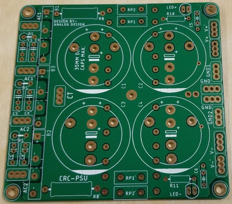 With four 10,000 uF Cornell Dubilier capacitors, pn # 380LX103M063A042 and a Vishay bridge rectifier, pn # PB3508-E3 / 45.