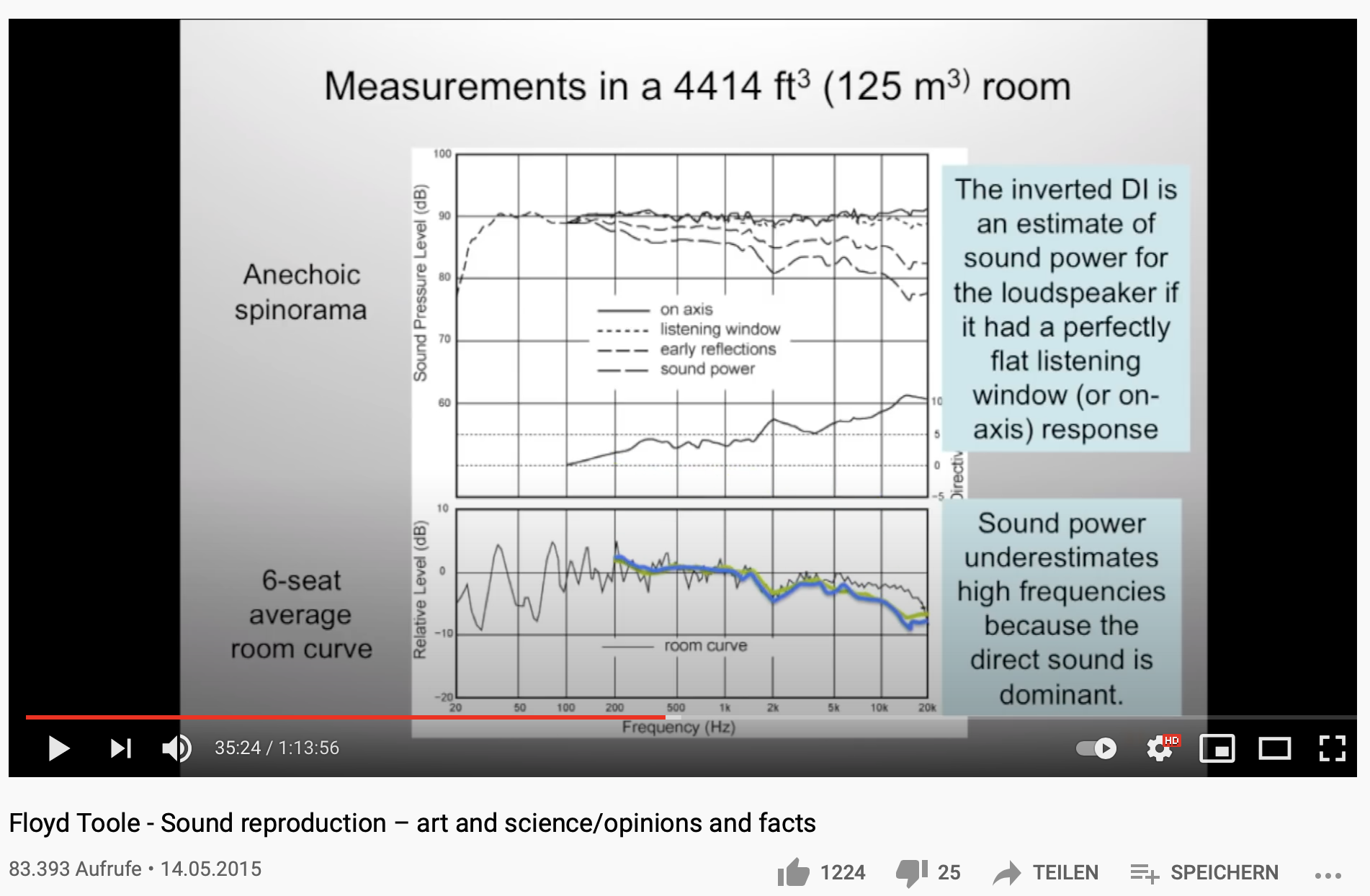 nach den Untersuchungen von Toole und Olive ist es aber eher der "invertierte Directivity Index (DI") bzw. die Kurve der "early reflections" die am ehesten mit der "Sound Power" Kurve (also der Betriebsschallpegelkurve am Hörplatz) korrelliert (Voraussetzung ist ein glatter Achsfrequenzgang, was bei BT ja meist zutrifft):