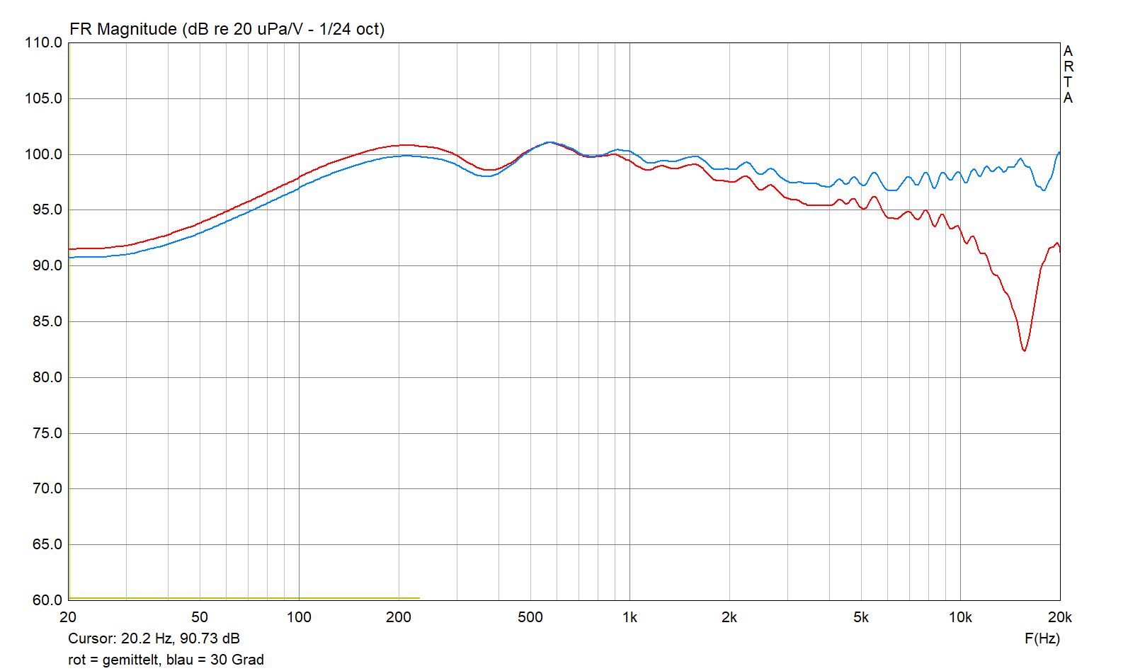 dass es bei 30° mit den Breitbändern nicht so passt, kann ich mir so vorstellen, dass Breitbänder ja ab ka < 1 in Partitialschwingungen aufbrechen, und dadurch die Schallabstrahlung nicht mehr gleichmässig unter den Winkeln erfolgt