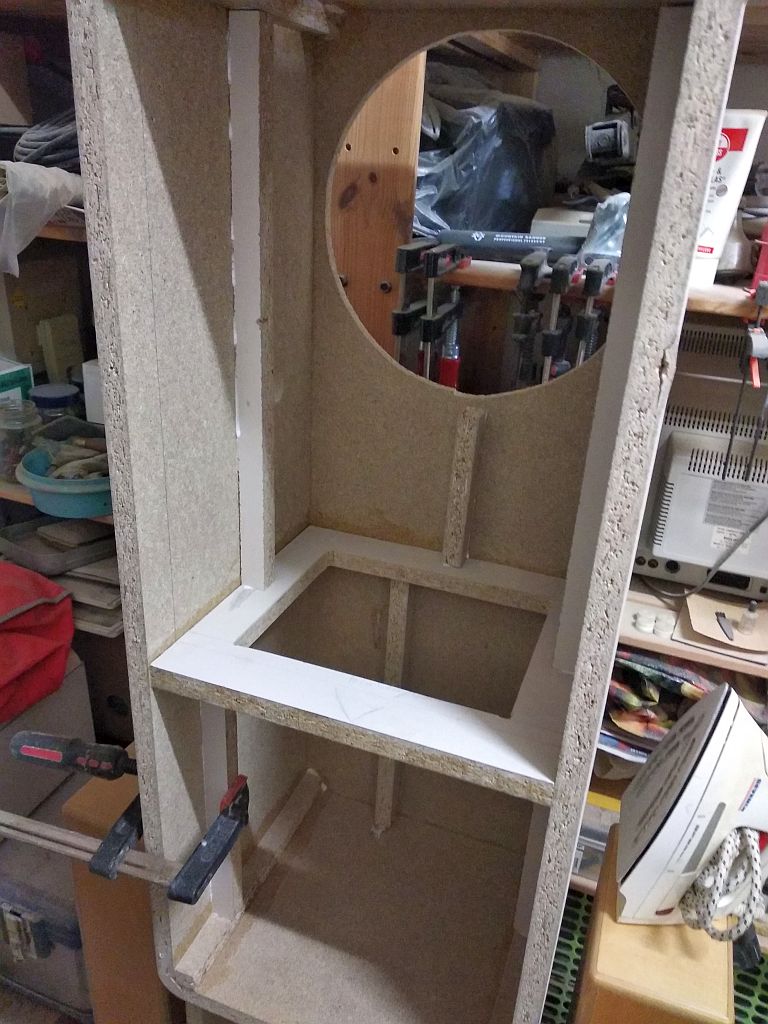 danke, oh ich vergaß:(, Innenmaße Höhe800, Breite 410, Tiefe 340. Gedämmt habe ich die Rückwand mit Schüttgut Pyramiden Basotect und was noch so herumlag, Polyester, Baumwolle; das Ganze mit Noppenschaumstoff und rundherum und zum Rücken abgestützt, so dass noch genug "Luft" zwischen Bass und Passivmembran war. Im Gartenvorrat habe ich noch ne Rolle Bambusfasern zum Frostschutz gefunden, mal sehen ob ich die sinnvoll noch mit einbaue. Ich habe das Gehäuse aus Dreischichtbambusleimholzplatte gebaut und die Ecken von innen mit Leisten verstärkt. Ich bin nicht mehr der Jüngste und will das Ganze leicht bauen. Ich werde noch jede Menge diagonale Raumstreben implementieren, die Wände schwingen noch zu stark .... mechanische Ruhe und Leichtgewicht sind eher Gegensätze:(. Augenblicklich werke ich aber eher an den 20.5.