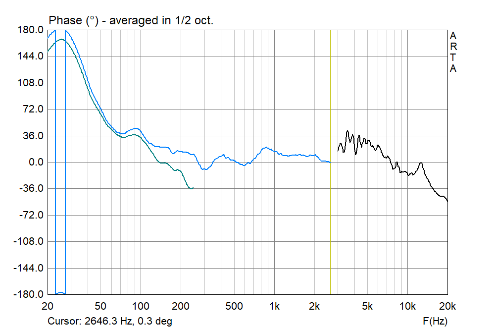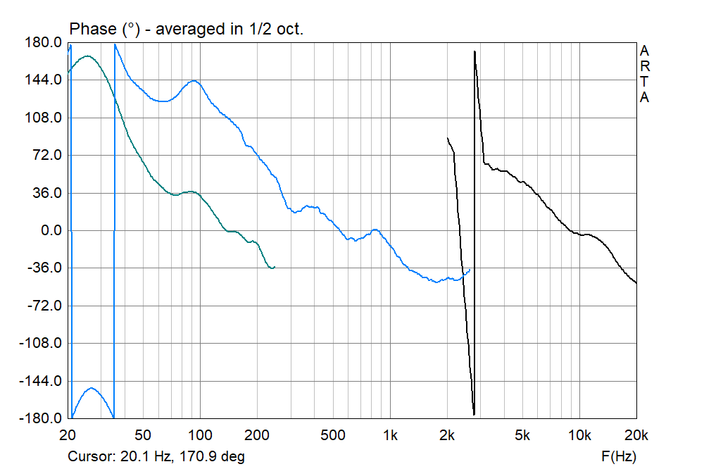 Resultat - schwarz Amplitude, türkis zur Überprüfung mit verpoltem Mitteltöner (-> es müssen sich Auslöschungen in den Bereichen der Trennungen zeigen), gelb Phase; Indoor-Fernfeldmessung, nur im Hochton fensterbar, d.h. keine aalglatten Kurven erwarten: