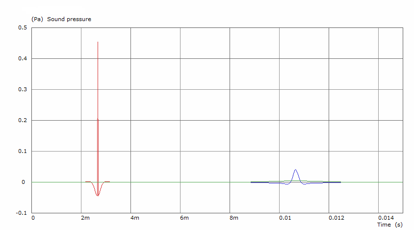 Schaun wir uns diese an. Grün die Impulsantwort des Tiefpasses des Tieftöners, blau die des Bandpasses (Hoch- & Tiefpass) des Mitteltöners, rot die des Hochpasses des Hochtöners; alles je LR24: