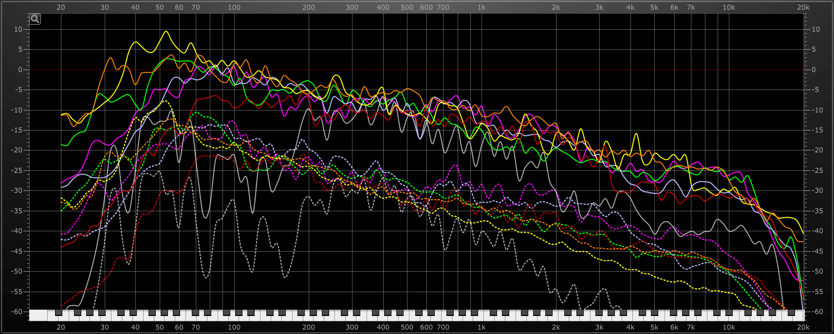 Die erste (oben) Grafik zeigt einige Musikstücke im Spectrum Analyzer - d.h. die digitalen Daten in Software analysiert, keine akustische Messung. Es sind zwei Pop-, ein Rock/Metal, ein HipHop, ein Gesang, und zwei Techno Lieder/Tracks. Eine Farbe stellt je ein Lied dar. Die durchgezogene Linie repräsentiert die Peaks über das gesamte Musikstück, die gestrichelte die Energie.