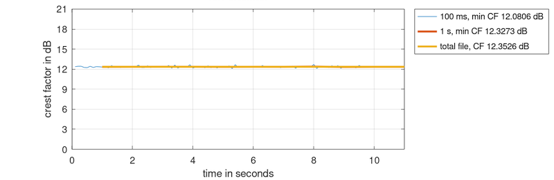 Ich verwende einen Multiton mit spektraler Verteilung nach EIA-426B und zufälliger Phasenlage wie in 60268-21 beschrieben*, damit komme ich auf 12,1 dB Crestfaktor, Lautstärke mit A-Filter. Also wie Anselm Goertz.
