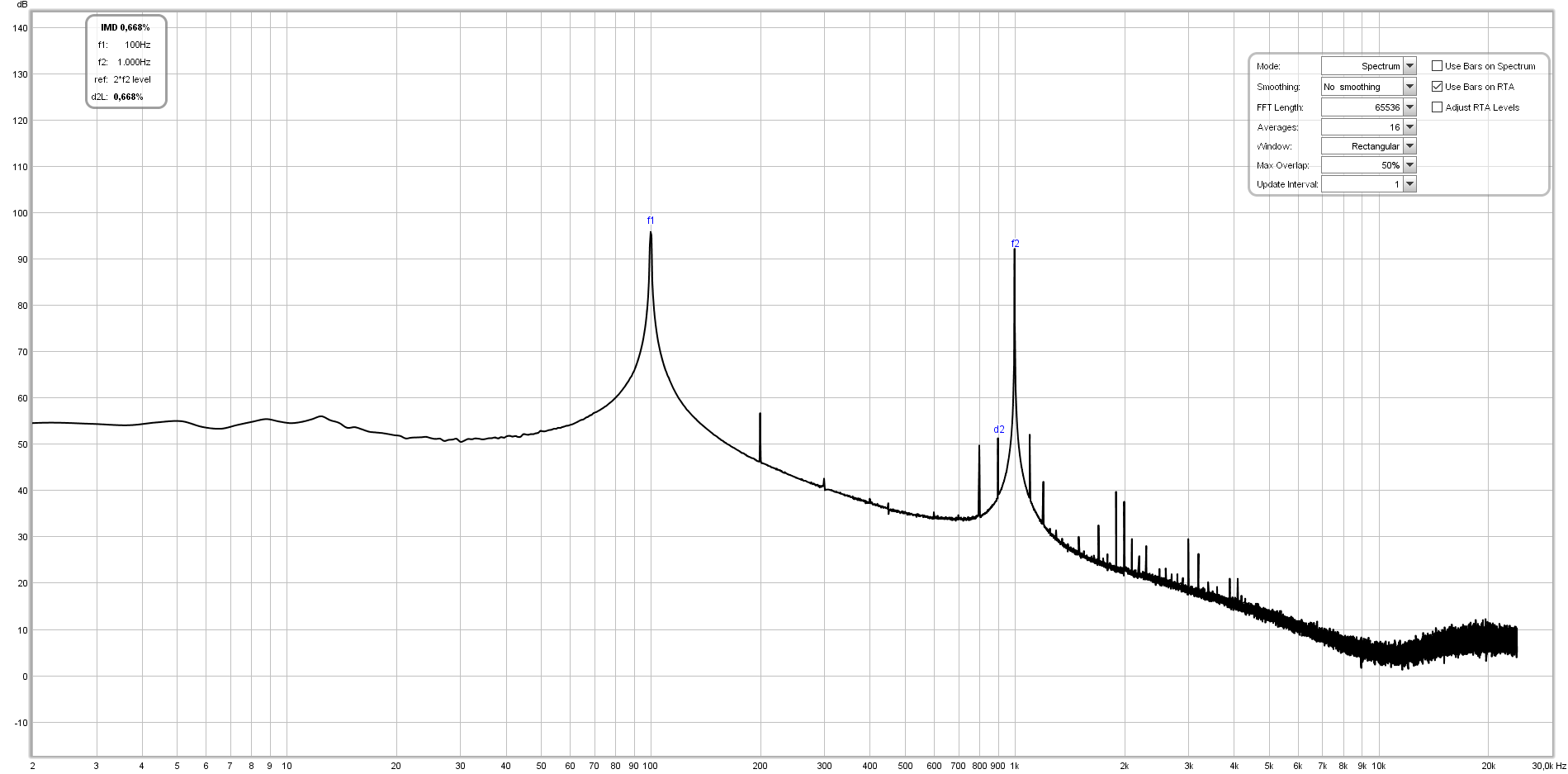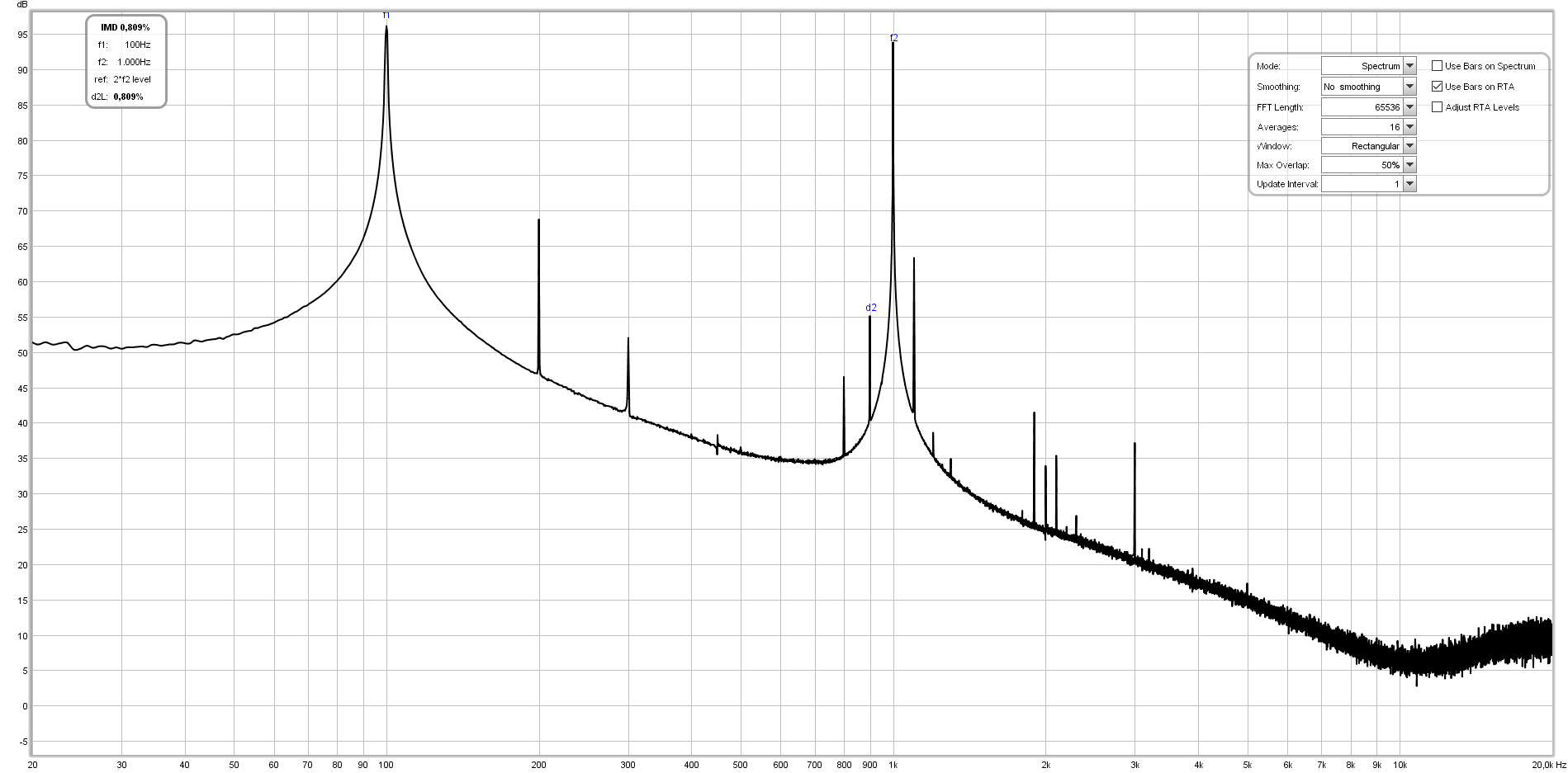 Dabei sollten IMD-Messung und Verzerrungsmessung mit Multiton-Anregung nicht in einen Topf geworden werden. Für IMD-Messungen werden zwei Sinustöne mit definiertem Abstand und Pegel eingesetzt, von denen dann noch - je nach Zweck - der höhere oder tiefere gesweept werden kann.