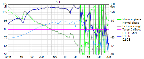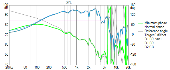Ich habe von Vituix keine Ahnung. Es sieht es immer so aus, als würde ohne die "rückwärtigen Schallanteile" durch den BR-Port gerechnet. Stutzig macht mich aber das GD+Phase Diagramm in #90. Die Phase scheint wie bei den anderen Diagrammen wieder ohne die "rückwärtigen Schallanteile" dargestellt. Aus der roten Phase würde sich bei ca. 30 Hz eine negatives GD ergeben. Das GD ist aber im selben Diagramm rein positiv. In Boxsim gibt es dafür ja den Button ohne oder mit Berücksichtigung der "rückwärtigen Schallanteile".