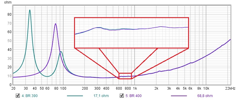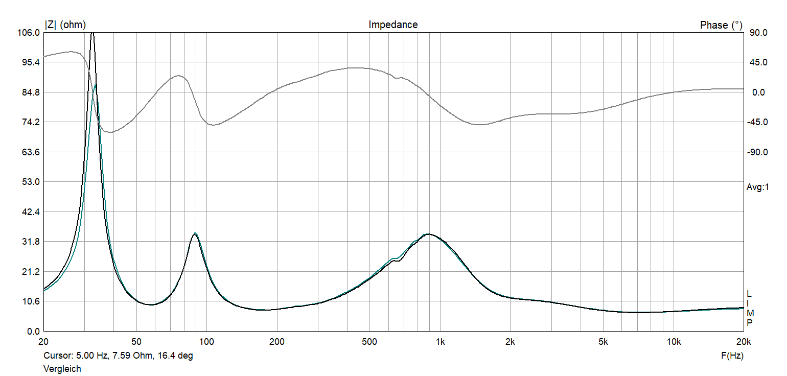 Nachdem ich zuerst nicht dazu gekommen bin, habe ich jetzt mal Impedanzen des Tieftöners gemessen, einmal mit offenem und einmal mit verschlossenem Kanal, das Ganze noch ein bisschen "verschönert":