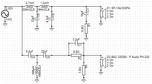 Inzwischen sind neue Teile vom Audio Tschentscher gekommen und ich habe dann gleich mal die Weiche aus Post 90, die ja mittels Simulationen aus Messungen, die klassisch von einem Punkt aus durchgeführt worden sind, entstanden ist (ich habe nur das Serien-R des Spannungsteilers auf zwei Widerstände verteilt).