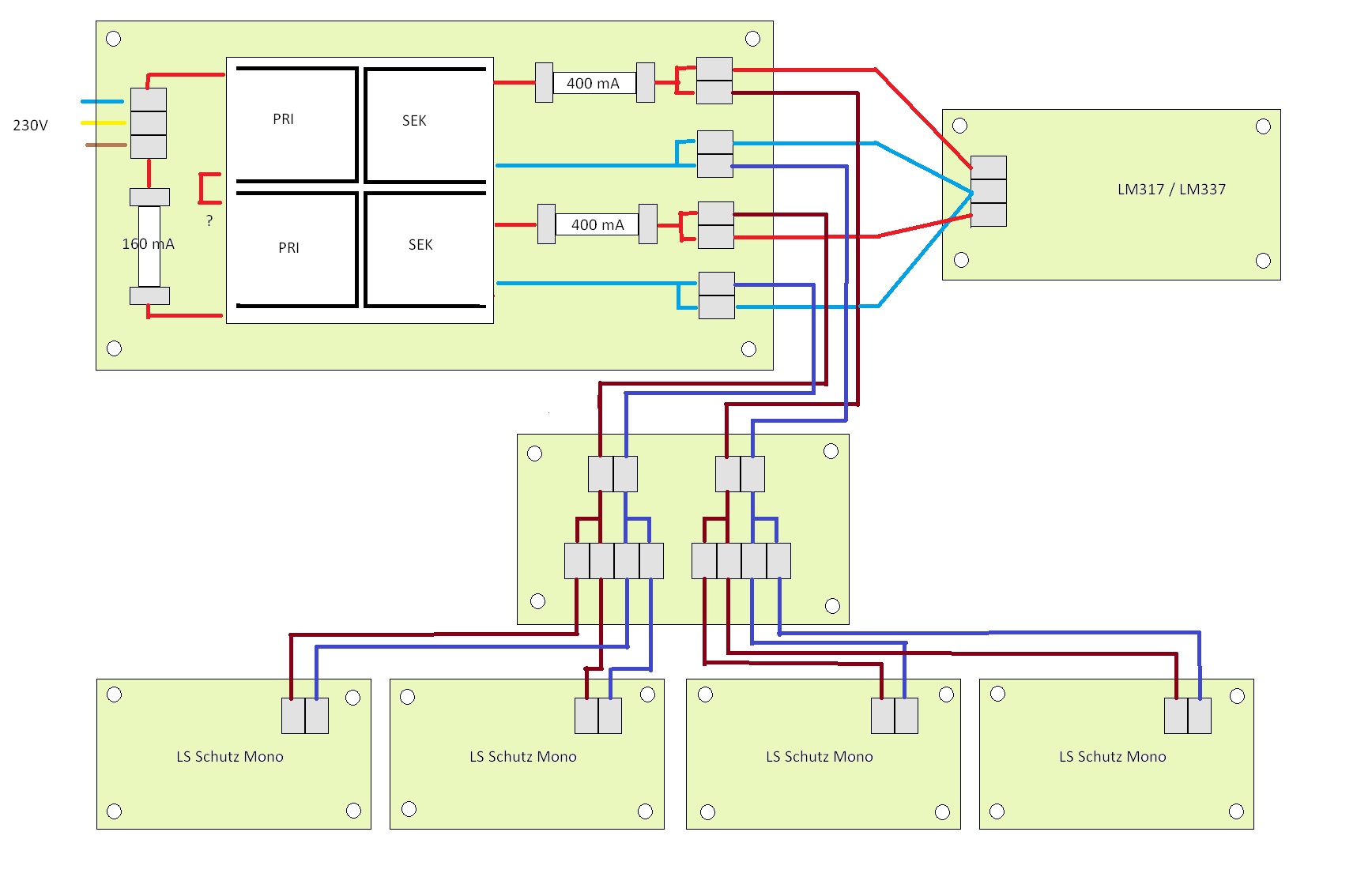 Die Anschlussplan Trafo -> Netzteil und LS Schutz hab ich mal versucht optisch in einem Bild festzuhalten - zumindest wie ich das verstanden habe (hoffentlich richtig).
