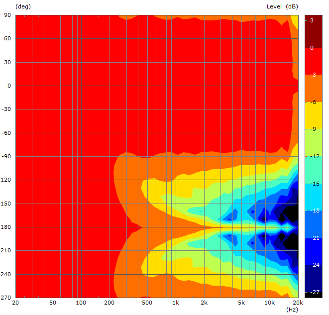 Man sieht hier schön, wie der Schall unterhalb einer bestimmten Frequenz anfängt, sich um das Gehäuse herum zu beugen. Die 6 dB, die vorne fehlen, werden dann in der hinteren Hemisphäre abgestrahlt.
