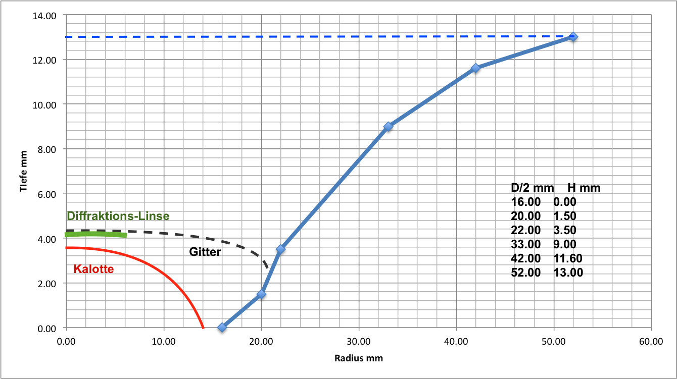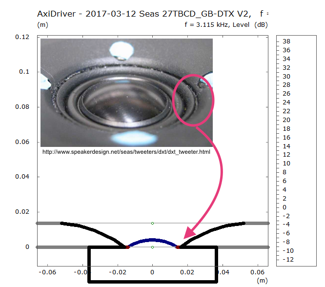 Die vielleicht wichtigsten Änderungen betreffen die Kontur zwischen Kalotte und Ditter, sowie die Höhe der Kalotte. Die jetzt angenommene Höhe der Kalotte ist 3mm, bei einem angenommenen Durchmesser von 28mm. Die Schallführung startet mit einem Durchmesser von 32mm. Dies soll die nicht bei der Schallabstrahlung mit wirkende 'Sicke' berücksichtigen. Im der Abbildung oben ist das entsprechend zu sehen. Hier das schon gezeigte (bearbeitete) Foto nach Abnahme des Gitters: