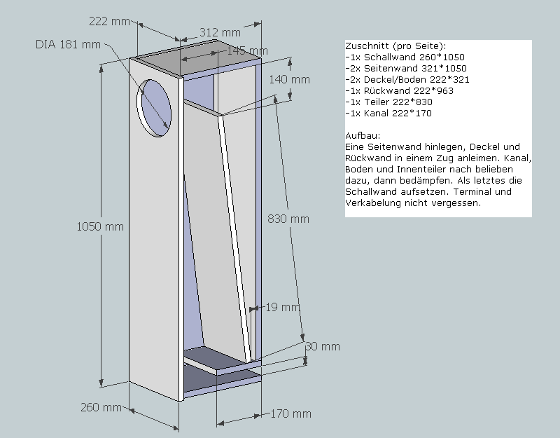 Habe jetzt mal in Google SketchUp einen "Bauplan" für die TQWT gezeichnet. Maße sind alle relevanten drin, ne Zuschnittliste und Aufbauanleitung ist auch integriert. Ich gehe mal davon aus, dass der TMT zu allen 3 Kanten gleichweit entfernt eingebaut wird? Falls nicht, kann ich das auch noch integrieren.