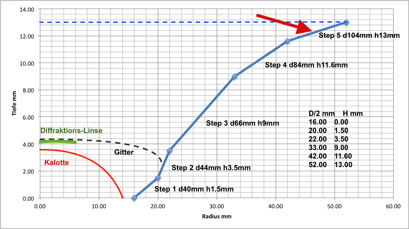 Schließlich noch der Versuch, den (minimalen) Einbruch auf Achse zu erklären. Dazu eine ungefähre Berechnung, unter der Annahme, dass die Wegdifferenz zwischen der Kalotte und der äußeren Kontur (Step 5) dafür verantwortlich ist: