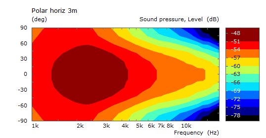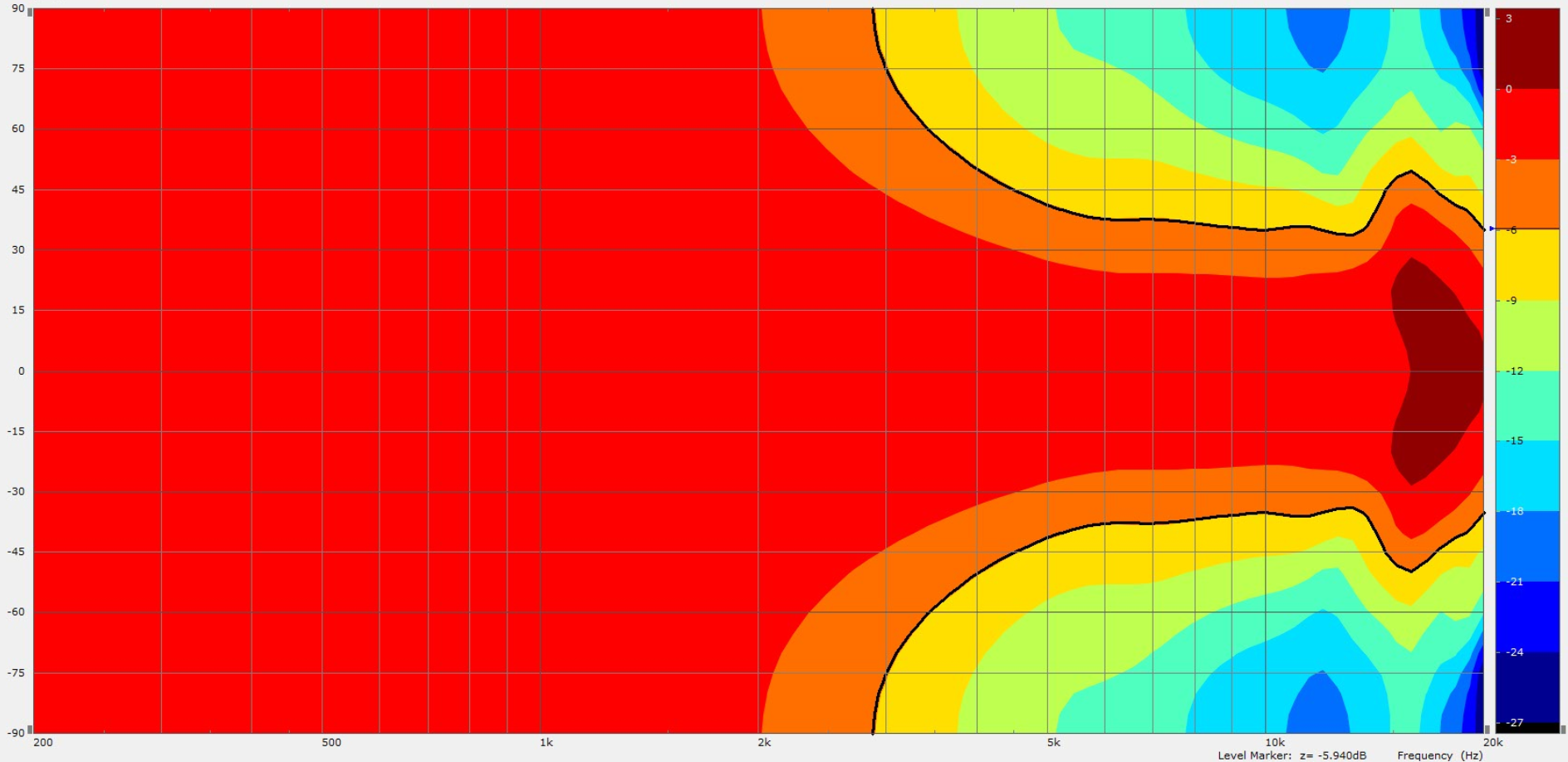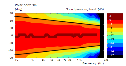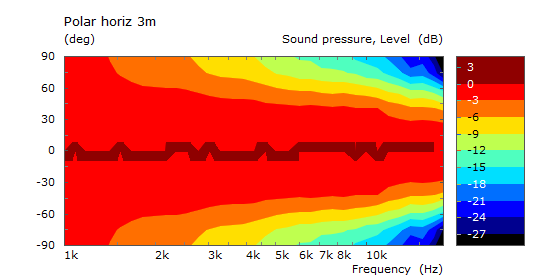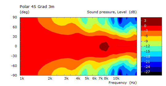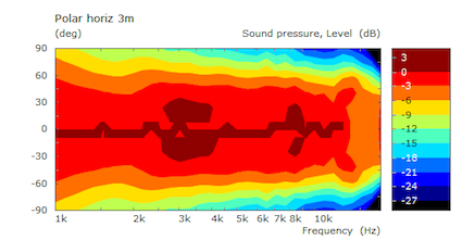 Zudem sind horizontal mit der gestrichelten blauen Linie jeweils die '90 dB-Linien' eingezeichnet. Es ist ganz schön zu sehen, wie - neben dem Bündelungsverhalten - der Schalldruck im Frequenzbereich zwischen grob 2 und 10 kHz durch den Aufbau der Schallführung erhöht.