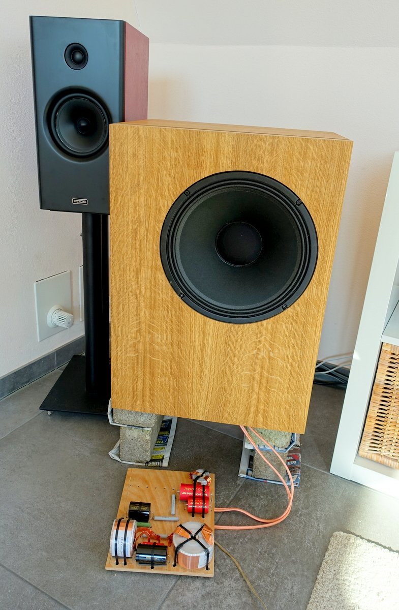 Heute höre ich zum ersten Mal die erste Box mit Weiche, allerdings fehlt noch die Grundtonentzerrung (RCL-Glied mit der 12 mH Spule).