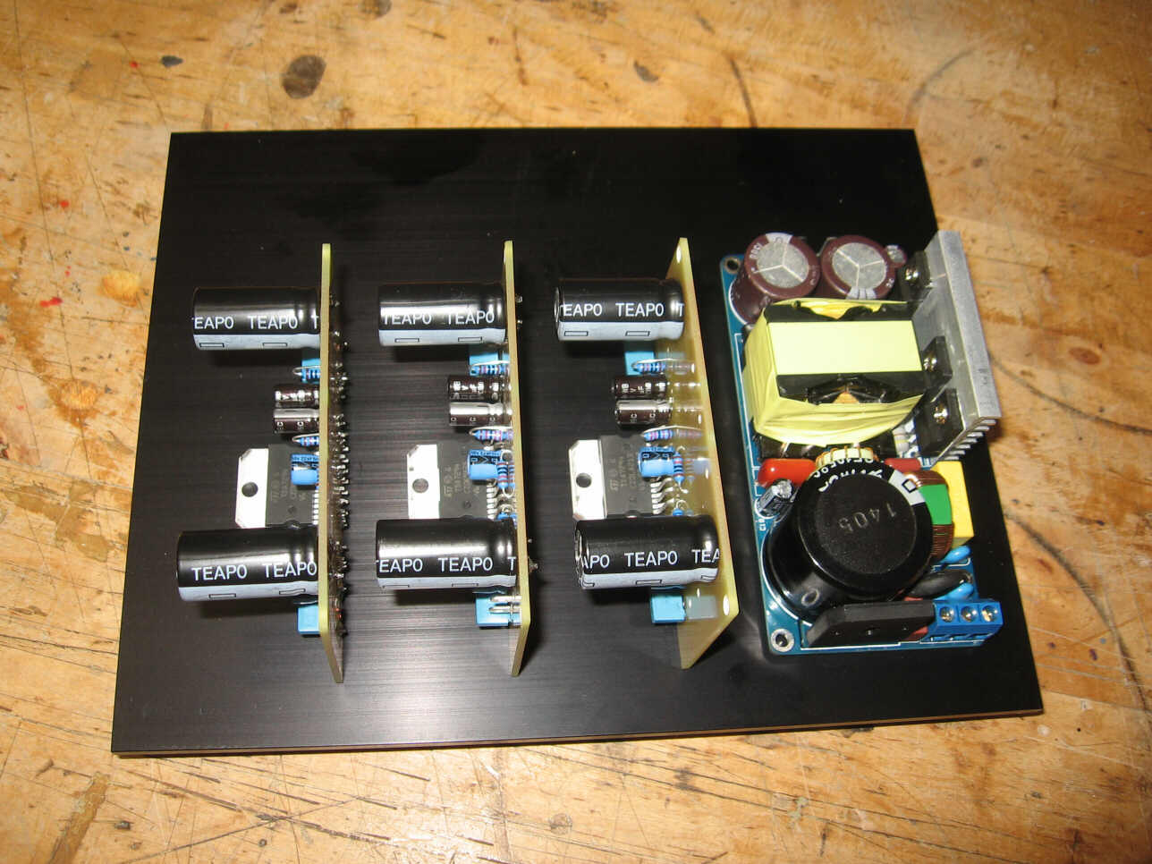 Diese allerkleinste Applikation für den TDA 7294 (elektor anno 1996) dreimal an einem SNT mit 320W peak ergibt so ziemlich das kleinstmögliche "Kraftwerk" für eine Aktivbox (theoretisch 3x 82W an 4Ohm, praktisch sind der Kühlkörper und das Netzteil dafür ein bissl´ knapp). Das Netzteil hat 100x50mm !