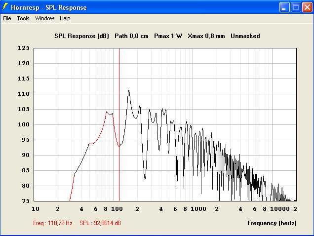 Tja, da ist die Konstruktion schon bei 1 Watt hublimitiert, und so bei 119 Hz geht nicht mehr wie 92 dB, nach Hornbedämpfung eher noch nur knapp 90 dB....